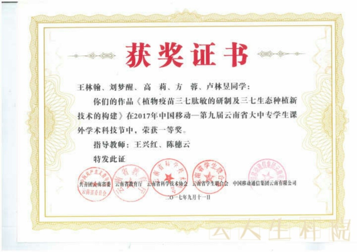 就在今年10月,生科院又迎来一大喜讯。我院2015级本科生王林翰,刘梦醒,高莉,方蓉等同学在王兴红,陈穗云老师帮助下研究的《植物疫苗三七肽敏的研制及三七生态种植新技术的构建》课题,荣获中国移动-第九届云南省大中专学生课外学术科技节一等奖,第十五届“挑战杯”全国大学生课外学术科技作品大赛三等奖!他们通过提高植物自身免疫的能力,不仅使农药的使用率降低,还能提高植物的产量。他们几个月饱含热情的付出,终于灌溉出胜利的果实。在此期间,他们经历曲折,经受打击,但是,他们不曾放弃,继续用满腔热血追逐最初的梦想。