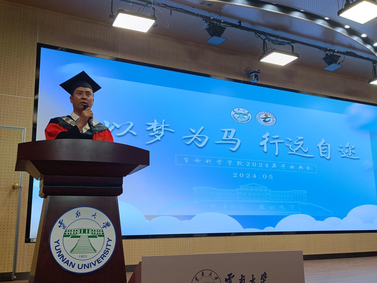 杨崇林以“常记泽湖波底月,更向云山万里行”寄语2024届毕业生,在过去四年里,云大生科与学院师生一同成长!在师资队伍,科学研究、教学科研平台等方面的建设取得了长足的进展。杨崇林说,2024届毕业生们即将各自踏上人生之征途,接受各种挑战和考验。祝愿大家顺应时代洪流,勇于承担时代赋与的使命,努力提升自己的专业能力和品德修养,不负韶华,不负此生! 期待未来云大生科学子们硕果累累,满载而归!
